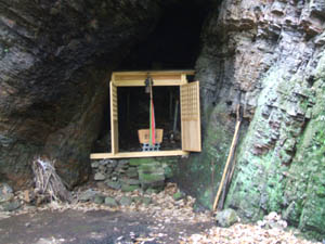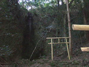 ■探訪記 国道177号沿ひの山中に鎮座します。 一の鳥居がある国道沿ひから手すりが付いた曲がりくねつた参道を登つて行くと、途中に大岩があり、さらに登ると鳥居があつて、巨大な磐座に抱かれた洞窟に祠が鎮座します。磐座の威圧感もあり、祠周辺は一種異様な雰囲気があります。 地元では「八田の行者はん」と呼ばれ、九月に行者祭が行なはれてゐます。 H20.12.26記 |