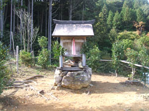 ■探訪記 本梅川沿ひに通つてゐる府道453号大河内口八田線から、宍人長谷の西の谷に入つたところの山裾に鎮座します。 個人でお祀りされてゐる金刀比羅さんです。 H21.3.26記 |